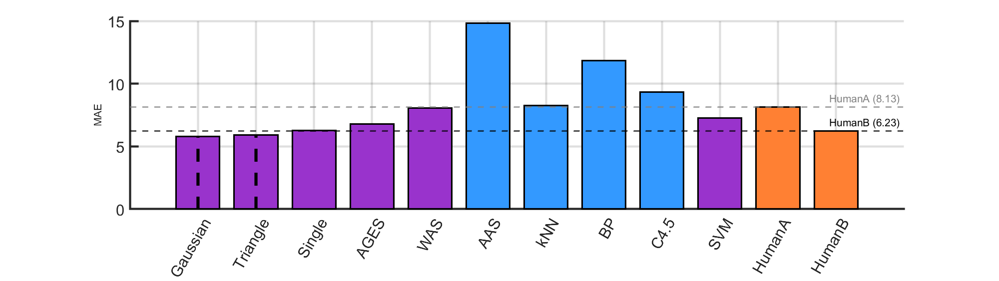 From the figure we can see that even without using label distributions, the IIS-LLD algorithm performs very well—thanks to the favorable properties of the maximum entropy model. Label distributions further enhance performance, pushing it beyond HumanB. The Gaussian distribution covers all ages, the triangle distribution only nearby ages, and the single-label case only the age itself—their performance decreases in that order.