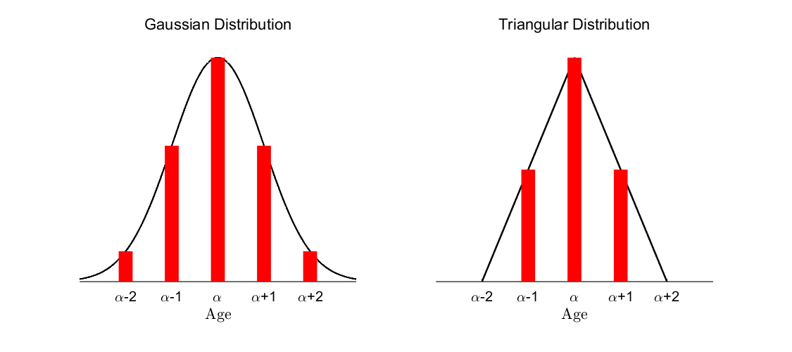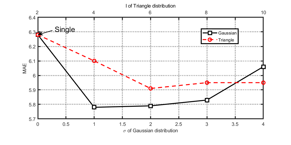 Here, \(l\) determines the span of the distribution. Compared with the Gaussian distribution, the triangle distribution is more localized, ensuring labels far from the original label do not influence the model.