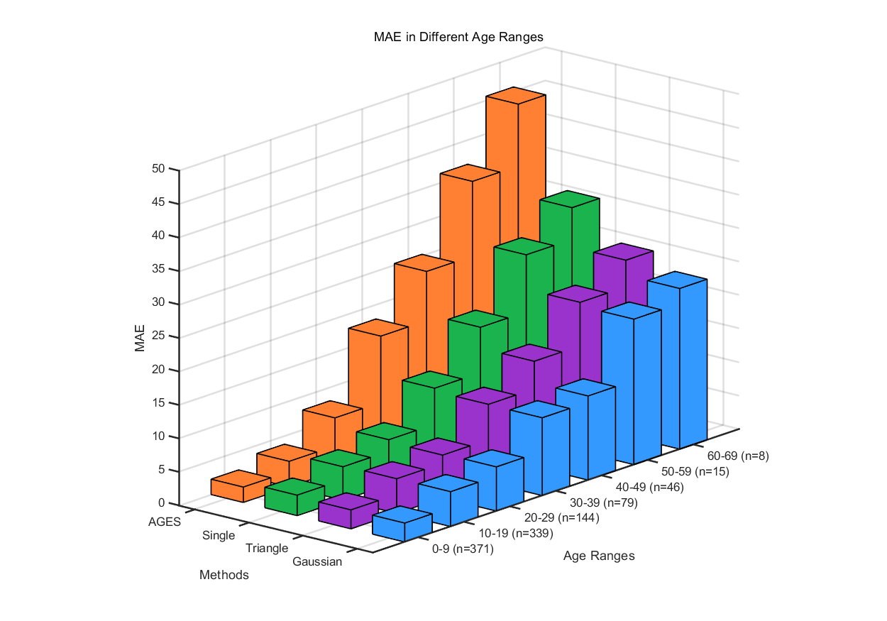 The experiments use the FG-NET Aging Database, which contains 1002 facial images from 82 subjects aged 0–69. Each subject has 6–18 photos, with variations in illumination, expression, and pose. Due to fewer samples at higher ages, the researchers adopt Leave-One-Person-Out (LOPO) cross-validation: each round uses one subject’s images as the test set and the others as the training set, repeated for 82 rounds to obtain the final result. Mean Absolute Error (MAE) is used as the error metric between predicted and true ages.