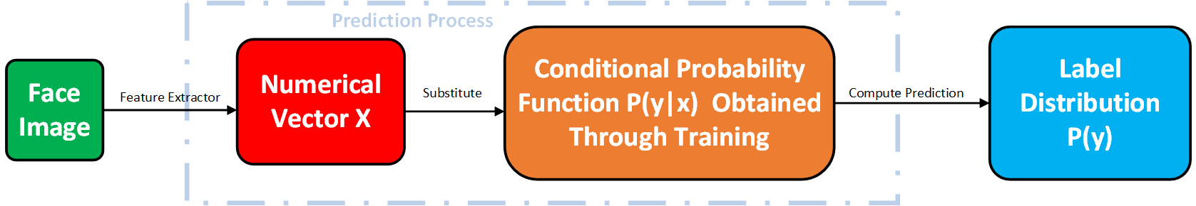 \[ \sum_y p(y|x; \theta) = 1, \quad \forall x. \] Feature functions may feel abrupt; think of them this way: if a feature function represents the number of facial wrinkles, then the trained model will, in expectation, fit the wrinkle count of the training samples. In the paper, the feature functions come from a feature extractor (a black box). Although its values are not directly interpretable, a good extractor outputs features highly related to the target (e.g., age), and this constraint lets the model optimally fit those prediction-related features.