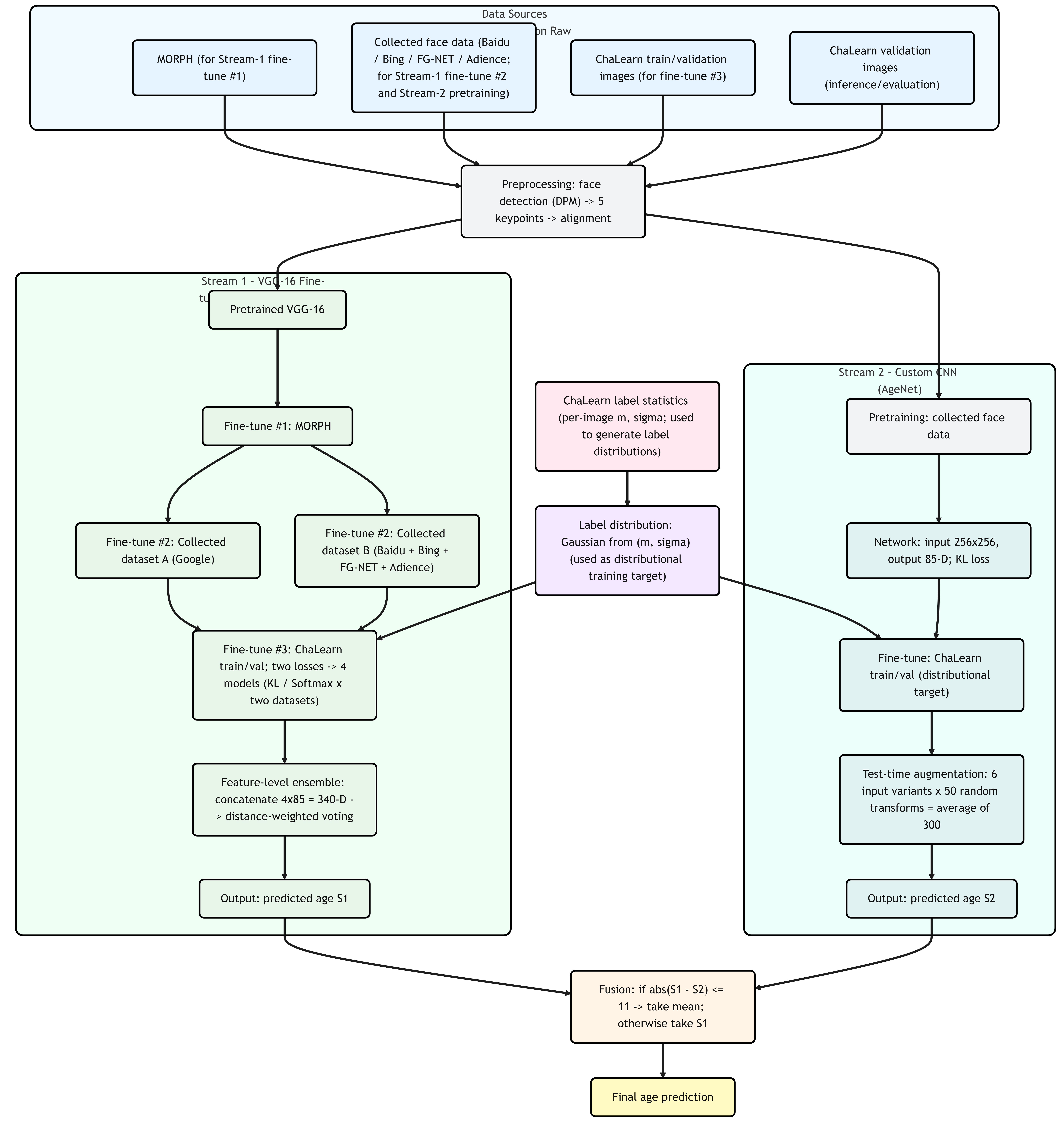 Late fusion. Fuse the two scalar age predictions: if their absolute difference is \(\le 11\) years, take the mean; otherwise, keep Stream-1’s result as final. Test images follow the same detect–align pipeline, the two streams infer independently, and the fusion rule produces the submission. The overall flow is shown below.