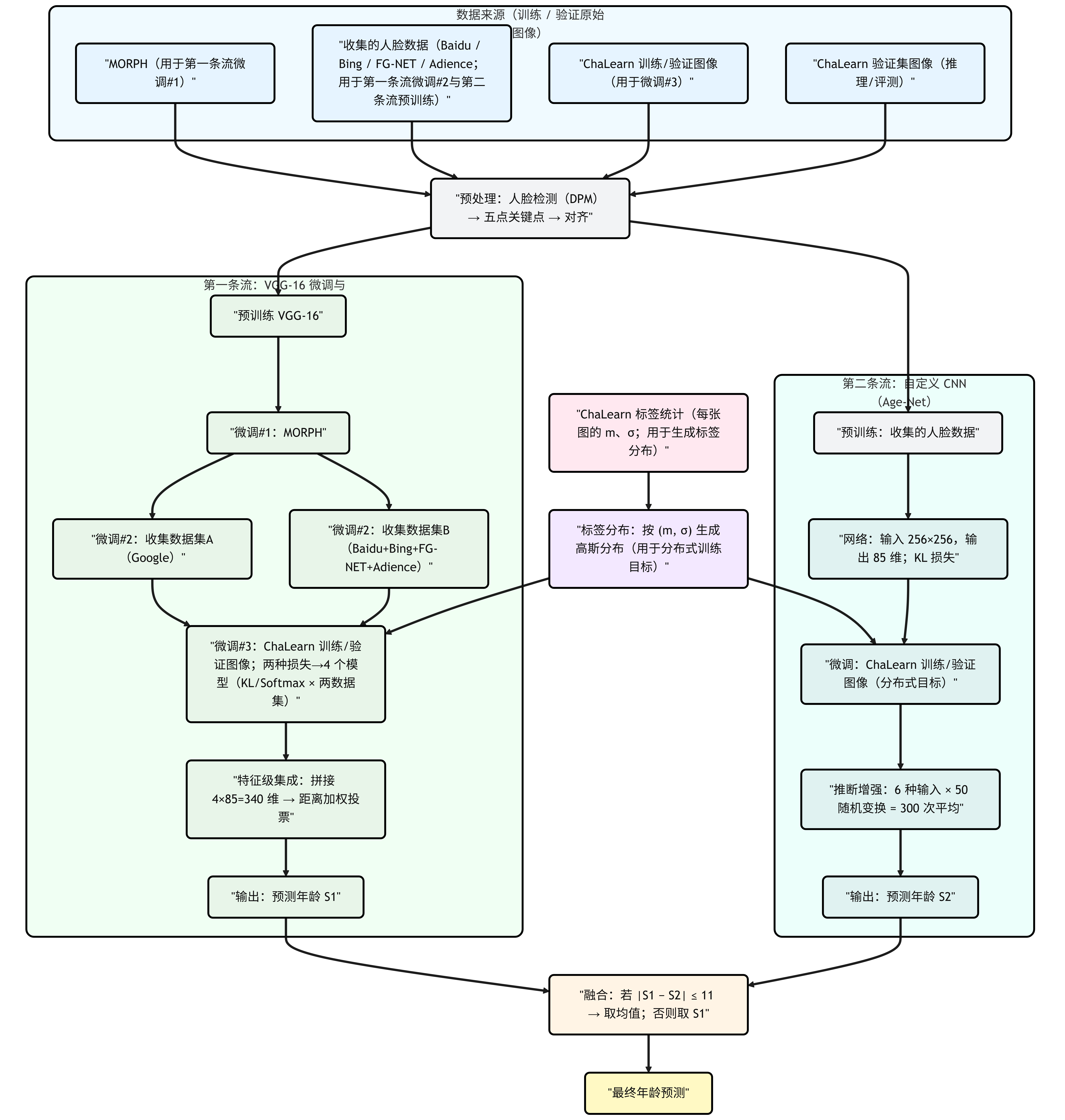 两条流在年龄标量上做简单融合:若两者预测差值不超过 11 岁,则取均值,否则采用第一条流的结果作为最终输出。比赛阶段的测试图像按同样的检测与对齐流程进入两条流,按上述规则融合得到提交成绩。详细流程如下图所示。